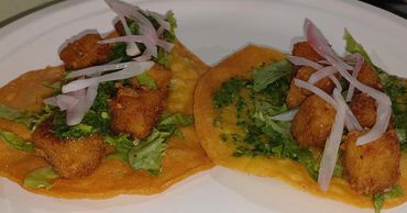Grilled corn tortilla, roasted sweet potato, black beans, roasted red pepper sauce, cilantro